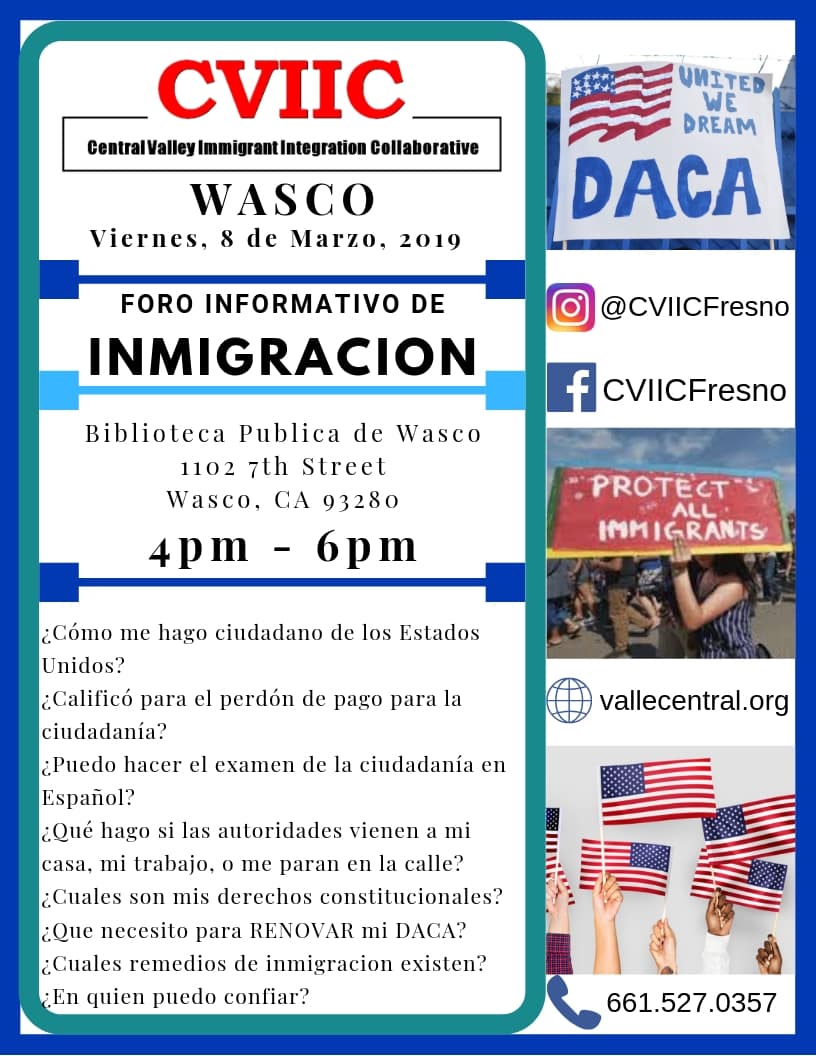 Foro Informativo de Inmigración en Wasco Viernes,8 de Marzo 4pm-6pm Foro Informativo de Inmigración en Wasco el 8 de Marzo 2019: La Red de Integración de los Inmigrantes en el Valle Central (CVIIC) tendrá un  Foro Informativo de Inmigración en la ciudad de Wasco en la Biblioteca Pública, 1102 7th Street, Wasco, CA 93280.  El...