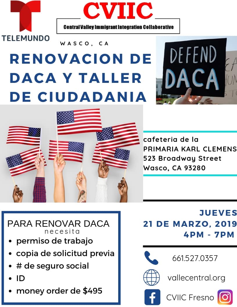 Taller de Renovación de DACA y Ciudadania en Wasco el Jueves 30 de Mayo 2019 : Cafeteria de la Primaria Karl Clemens CVIIC (Central Valley Immigrant Integration Collaborative),  y organizaciones no lucrativas que son socias de nuestra red regional ofrecen al público un taller de renovación de DACA y ciudadania en Wasco el 30 de...
