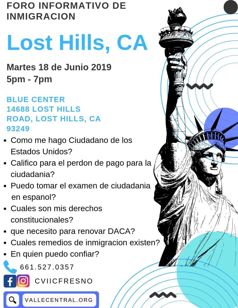 Foro Informativo de Inmigración en Lost Hills Martes 18 de Junio 2019: La Red de Integración de los Inmigrantes en el Valle Central (CVIIC) tendrá un Foro Informativo de Inmigración en la ciudad de Lost Hills, en el Blue Center, 14688 Lost HIlls Road, Lost Hills, CA 93249 . El evento se llevará a cabo de las 5pm – 7pm. Se presentará la siguiente información: