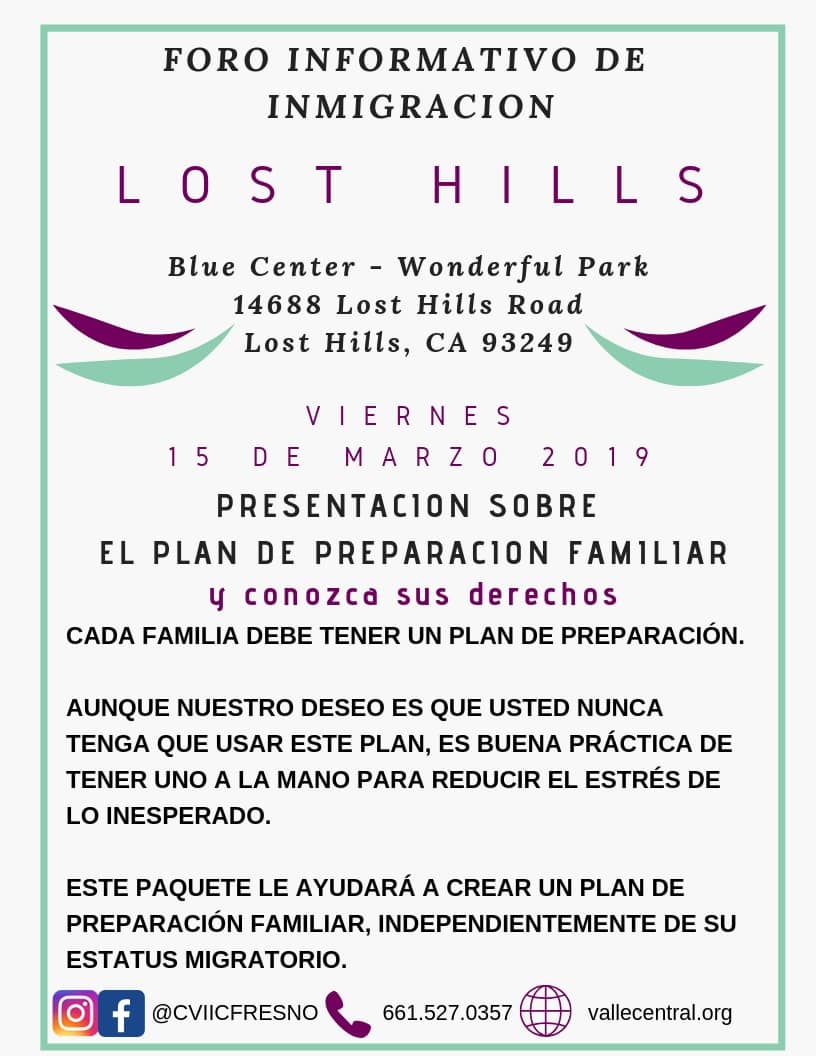 Foro Informativo de Inmigración y Taller de Preparacion Familiar en Lost Hills Viernes 15 de Marzo 2019 5pm – 7pm
