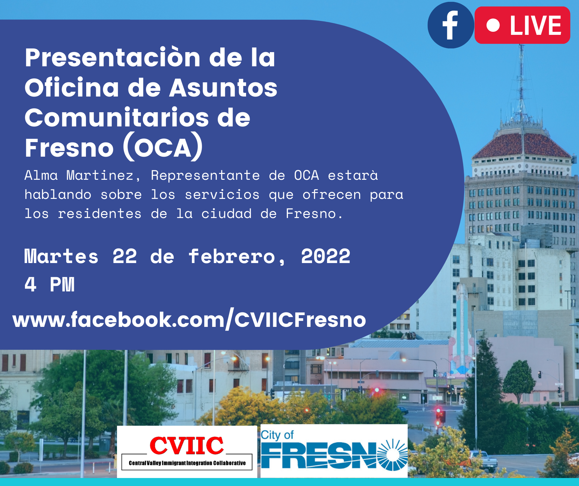 Presentación de la Oficina de Asuntos Comunitarios de la Ciudad de Fresno: CVIIC y la Oficina de Asuntos Comunitarios de la Ciudad de Fresno (OCA por sus siglas en inglés) lo invitan el proximo martes 22 de febrero del 2022 al Facebook Live Event, en donde Alma Martinez, Representante de OCA, estará hablando sobre los servicios que esta oficina ofrece a todos los residentes de la ciudad de Fresno, en temas como emprendimiento, apoyo a inmigrantes, salud pública, seguridad, asistencia a compradores de casa por primera vez, asistencia de alquiler en casos de emergencia, entre otros.