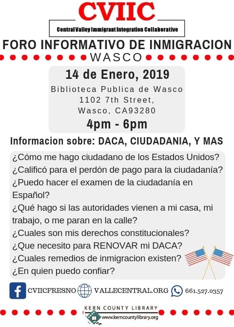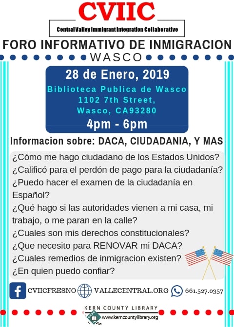 Wasco Branch Library 1102 7th Street, WascoForo Informativo de Inmigración en Wasco Viernes,8 de Marzo 4pm-6pm Foro Informativo de Inmigración en Wasco el 8 de Marzo 2019: La Red de Integración de los Inmigrantes en el Valle Central (CVIIC) tendrá un Foro Informativo de Inmigración en la ciudad de Wasco en la Biblioteca Pública, 1102 7th Street, Wasco, CA 93280. El...