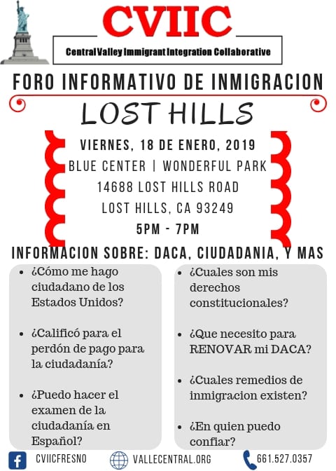 Wonderful Park 14688 Lost Hills Road, Lost HIlls, CA, United StatesForo Informativo de Inmigración en Lost Hills Martes 30 de Julio 2019 5pm - 7pm Foro Informativo de Inmigración en Lost Hills Martes 30 de Julio 2019: La Red de Integración de los Inmigrantes en el Valle Central (CVIIC) tendrá un Foro Informativo de Inmigración en la ciudad de Lost Hills, en el Blue Center,...
